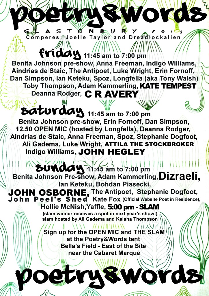 Our line-up for 2013 featured: Joelle Taylor; Dreadlockalien; Benita Johnson; Anna Freeman; Indigo Williams; Aindrias de Staic; The Antipoet; Luke Wright; Erin Fornoff; Dan Simpson; Ian Keteku; Spoz; Longfella (AKA Tony Walsh); Toby Thompson; Adam Kammerling; Kate Tempest; Deanna Rodger; CR Avery; Stephanie Dogfoot; Ali Gadema; Attila the Stockbroker; John Hegley; Dizraeli; Bohdan Piasecki; John Osborne; Kate Fox (Official Website Poet in Residence); Hollie McNish; Yaffle; and Keisha Thompson.