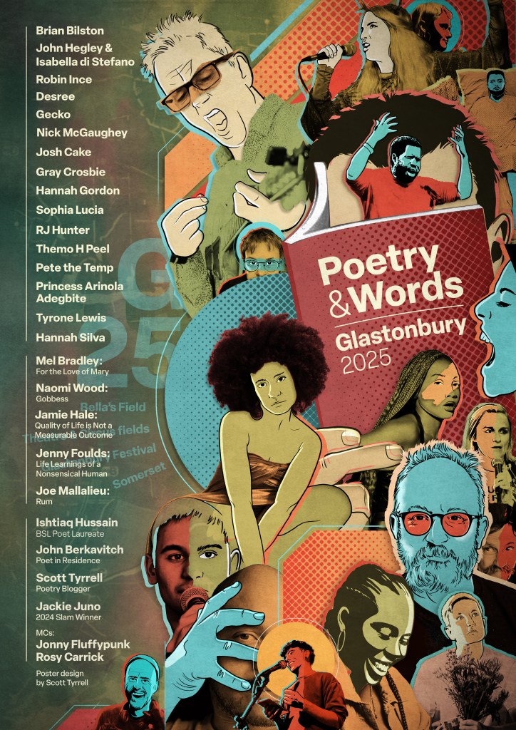 Our 2025 line-up featured: Brian Bilston, John Hegley, Robin Ince, Gecko, Desree, Tyrone Lewis, Glastonbury Festival Poet in Residence – John Berkavitch, the 2025 BSL Poet Laureate, R J Hunter, Sophia Lucia, Nick McGaughey, Gray Crosbie, Princess Arinola Adegbite, Josh Cake, Themo H Peel, Pete the Temp, Hannah Silva, Hannah Gordon, Scott Tyrrell, the 2024 Glastonbury Poetry Slam Champ – Jackie Juno, Naomi Wood (‘Gobbess’), Mel Bradley (‘For the Love of Mary’), Jamie Hale (‘Quality of Life is Not a Measurable Outcome’), Jenny Foulds (‘Life Learnings of a Nonsensical Human’), and Joe Mallalieu (‘Rum’).
